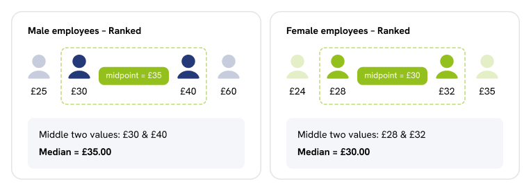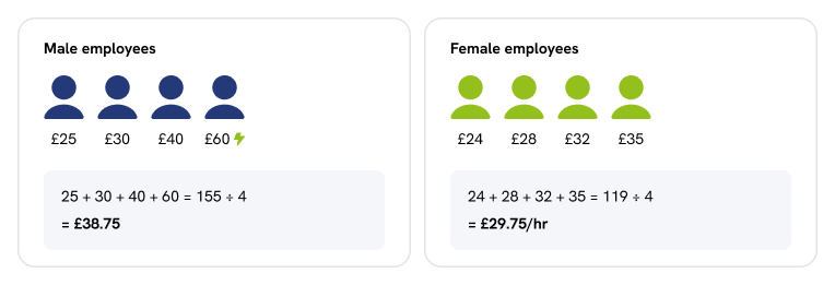 Imagine you have eight employees, four male who earn £25, £30, £40, and £60 per hour and four female who make £24, £28, £32, and £35 per hour.